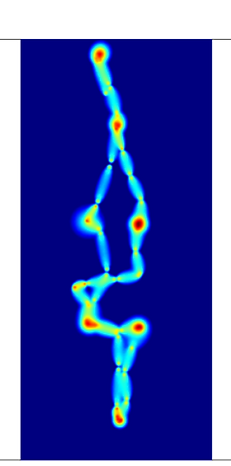 As a bumblebee worker gains experience foraging from an array of flowers, her flight path evolves. I developed a way to visualise how similar each flight is to the flight before. The first two images show two separate flights by the same bee at different stages of learning. The final image shows the probability that she utilised the same parts of the landscape on each flight. Some parts of the two flights were almost identical (the stretch from the nest to the first feeder at bottom right, and an unexpected, but very repeatable detour at the top of the image), while other legs of the journey (notably the movements between feeders in the centre of the image) changed drastically between flights.